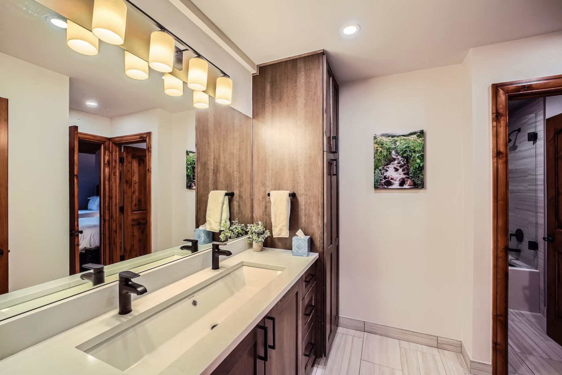 All four bedrooms are on 2nd floor, have high vaulted ceilings, large windows with beautiful views! Master suite has king size bed, golf and mountain view, en-suite luxury bathroom, and closets. Kids' bedroom has bright window, twin/full bunk beds (sleeps 3), and a bonus loft access via spiral staircase, with two single beds. The kids room is very fun and can accommodate up to five kids/teens. The guest bedroom has one queen and one twin beds north facing windows, and a direct access to the bathroom, perfectly suited for a 2nd master suite. The newly added family room/4th bedroom can be used also as an office/sitting area, with large windows on two sides. The entire house has custom woodwork throughout, and tasteful furnishings.